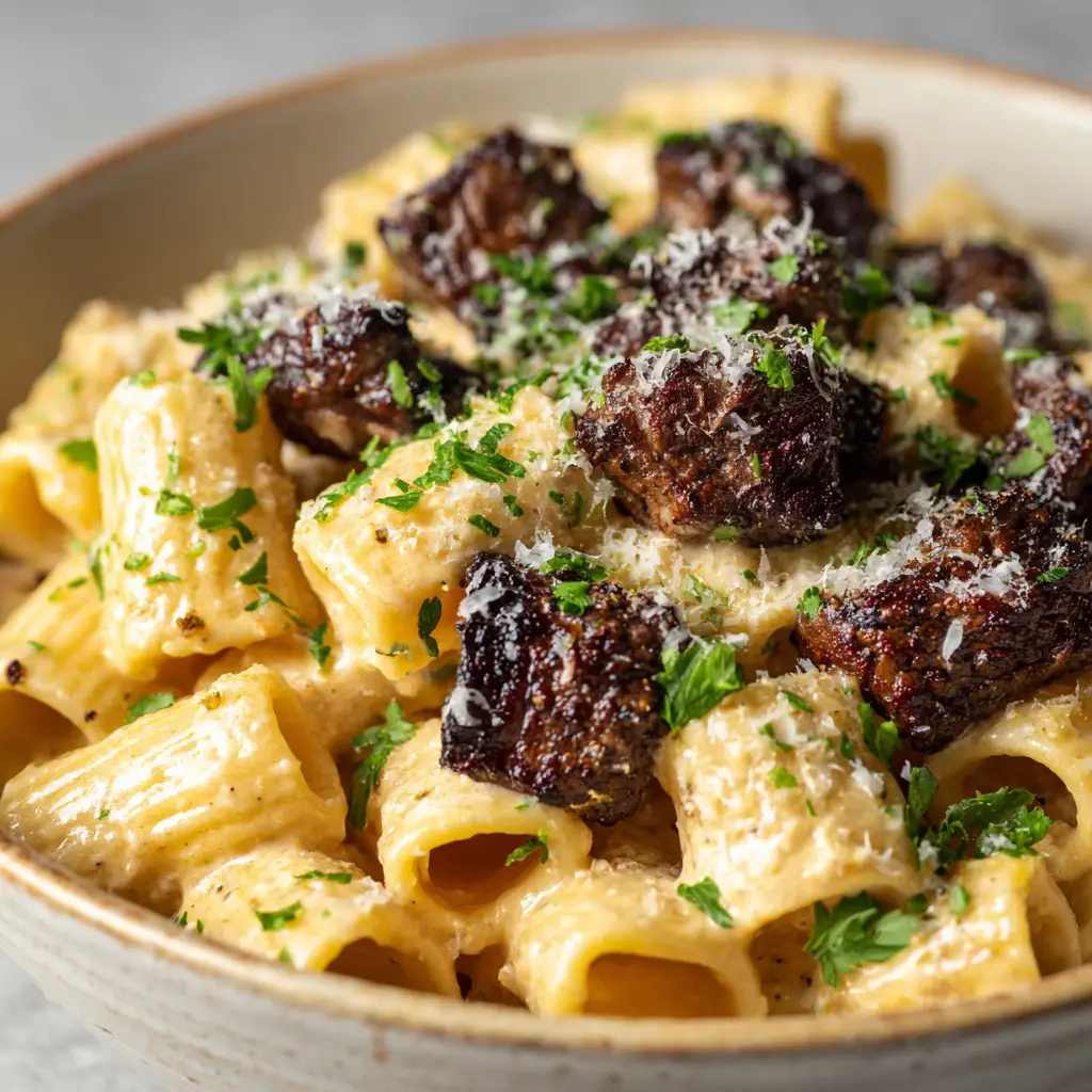 7. Toss the cooked rigatoni and seared steak bites into the cream sauce. Add a splash of pasta water if needed to thin the sauce. Garnish with chopped parsley and extra Parmesan cheese.