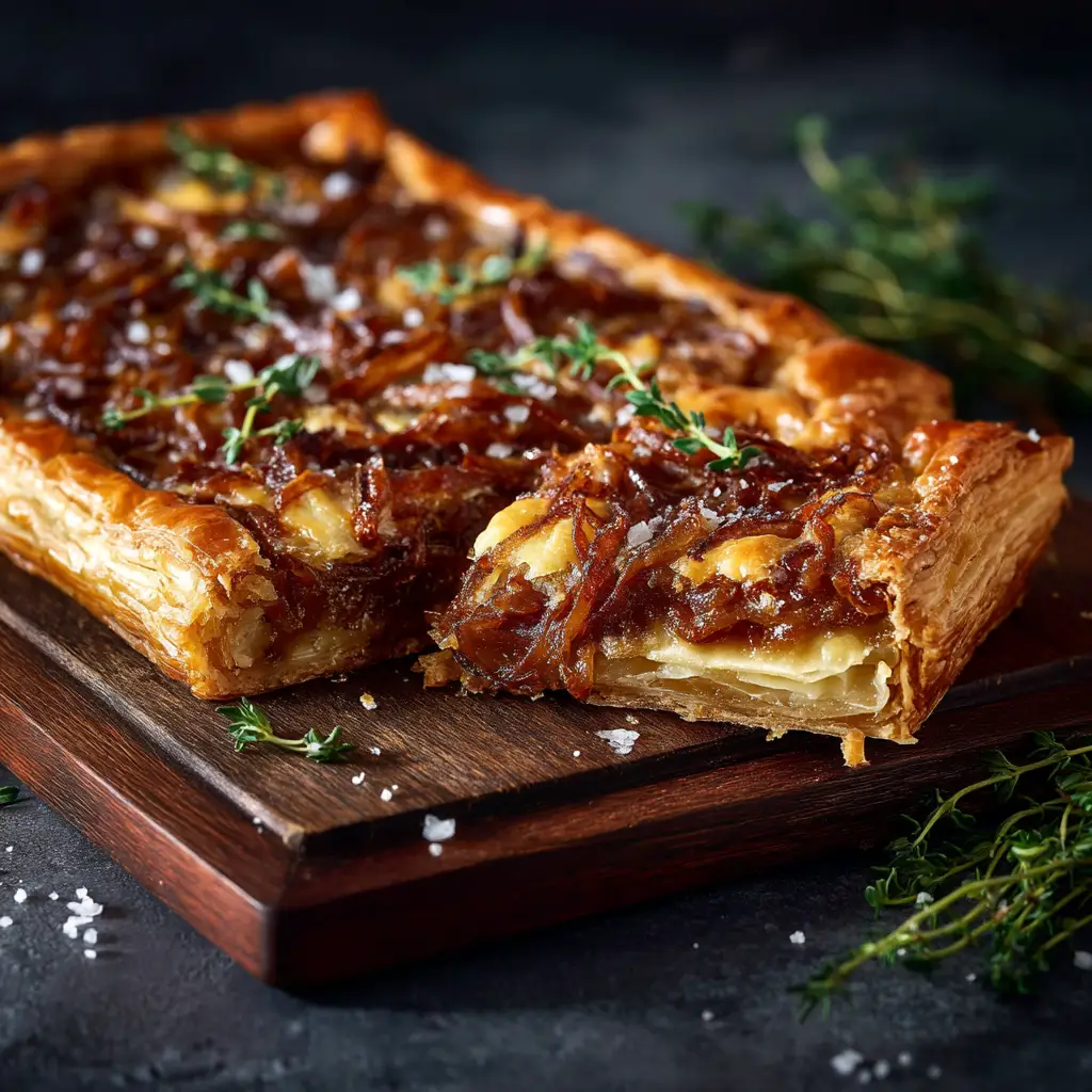 A beautiful rectangular Caramelized Onion Tart with a golden puff pastry crust, topped with jammy onions, melted Gruyère cheese, and fresh thyme.