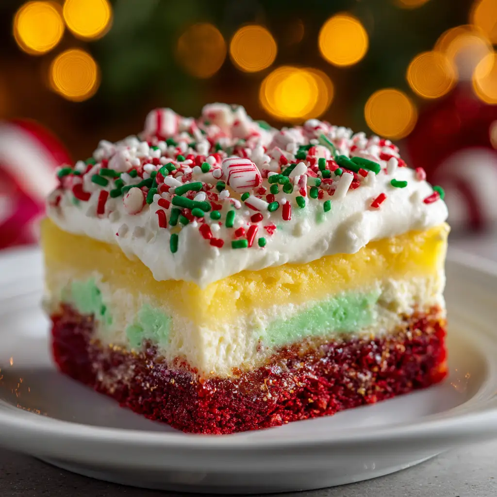 We start with a simple red velvet cake mix, bake it to perfection, and then poke holes across the top. A decadent mixture of white chocolate pudding and sweetened condensed milk soaks into the cake, making it unbelievably moist. Topped with a classic cream cheese frosting and a sprinkle of festive red and green, it’s a dessert that truly captures the magic of the season.