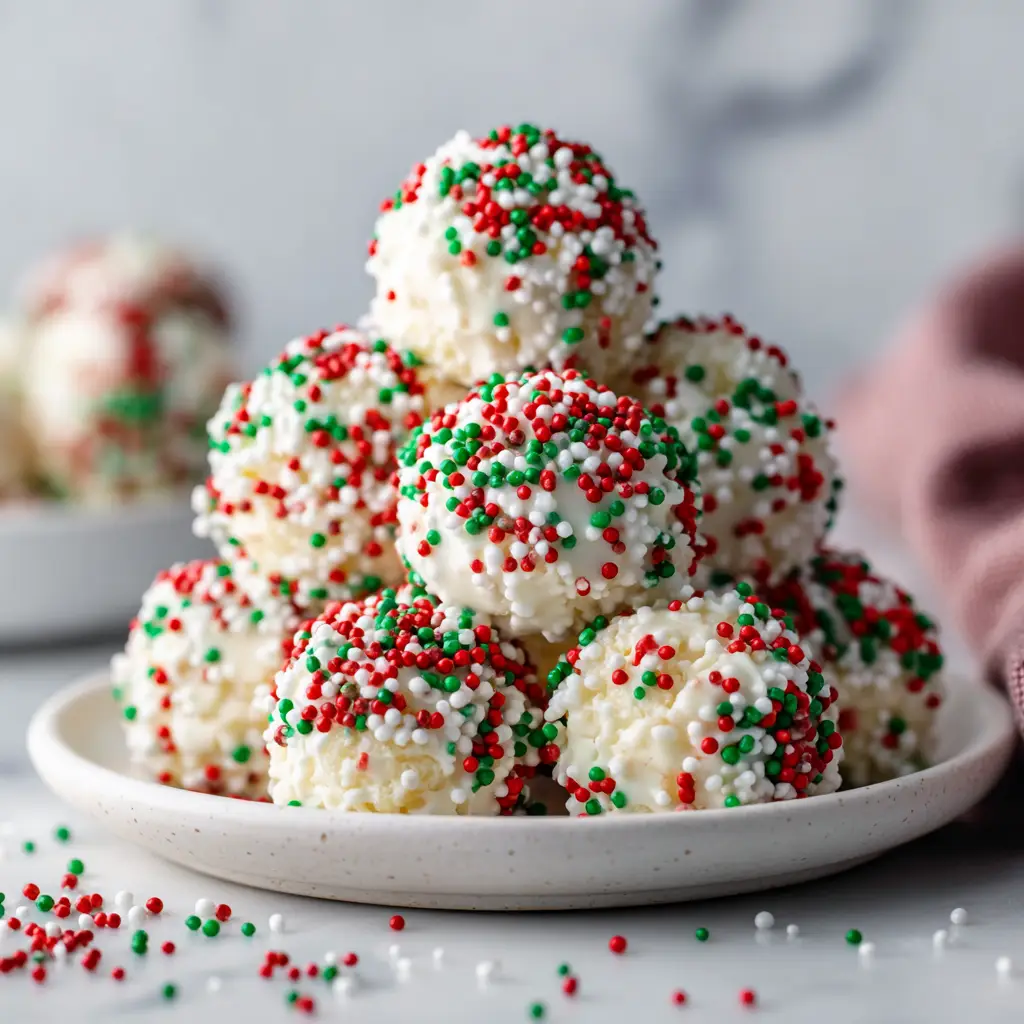 A close-up of green Christmas Rice Krispie treat balls decorated with red and white holiday sprinkles on a festive plate.