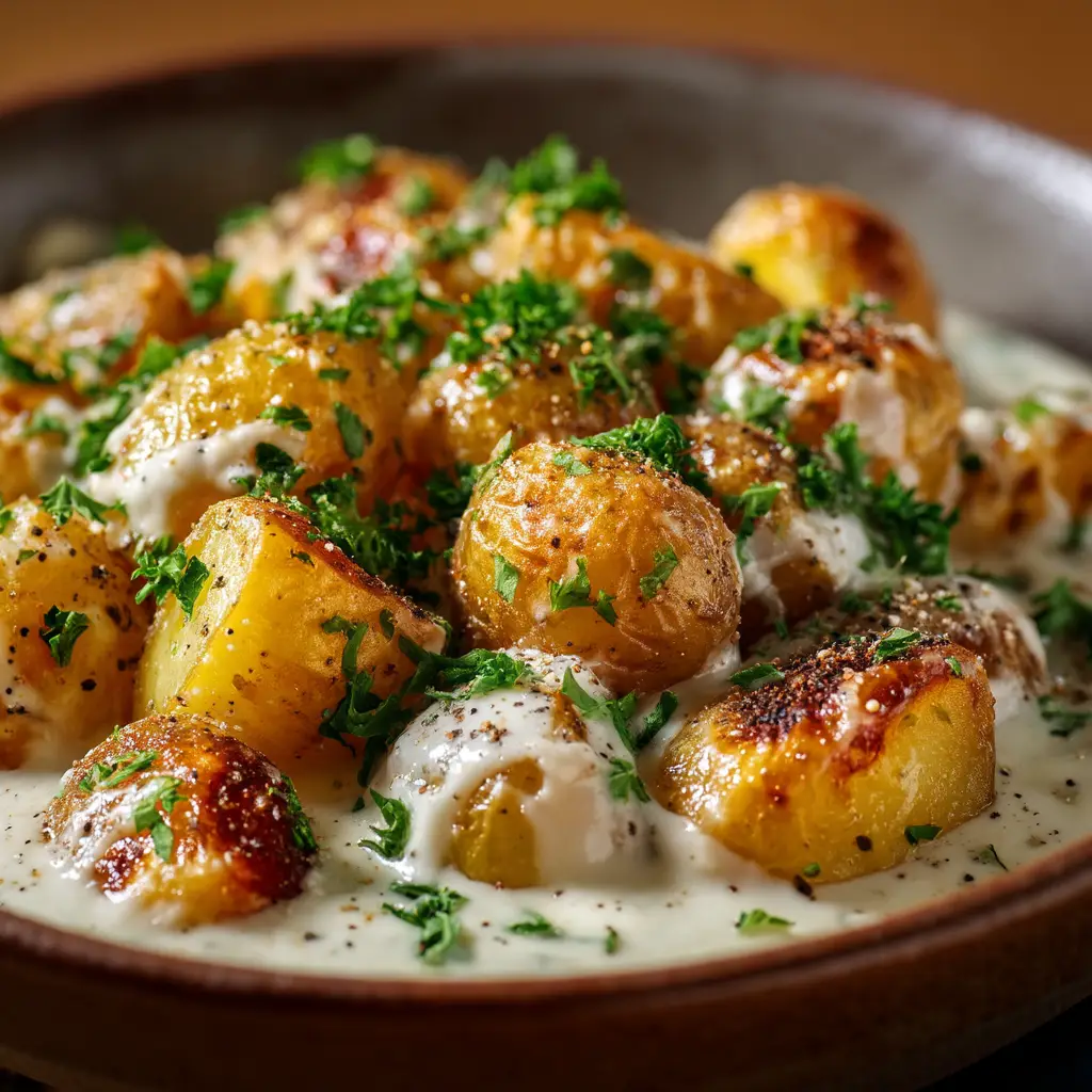 A top-down view of Creamy Garlic Baby Potatoes in a rustic serving dish, garnished with fresh parsley. The potatoes are golden brown and coated in a luscious cream sauce.