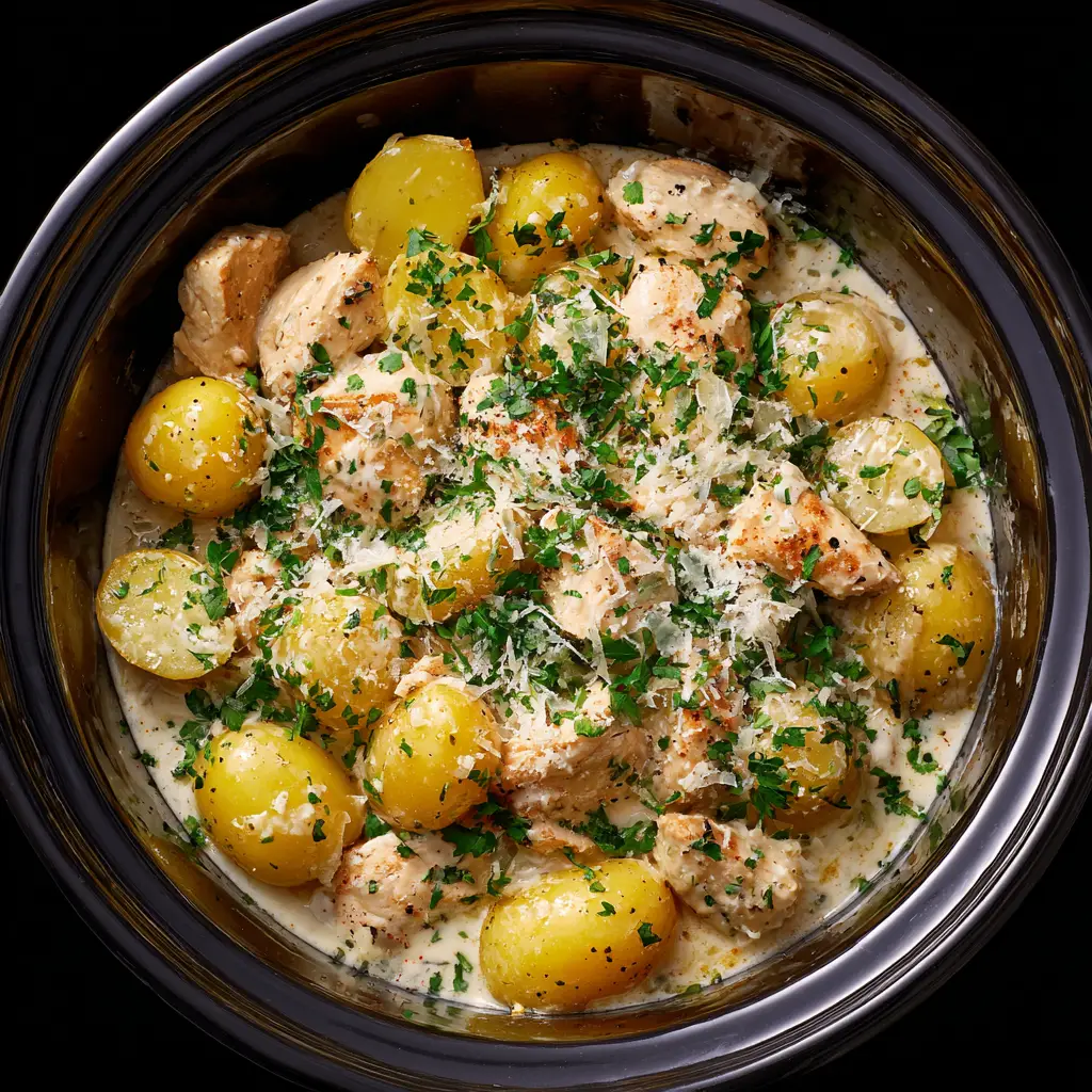 Once the sauce has thickened and emulsified into a smooth, velvety blanket over the chicken and potatoes, turn off the slow cooker. Give it one final, gentle stir to redistribute any melted cheese.