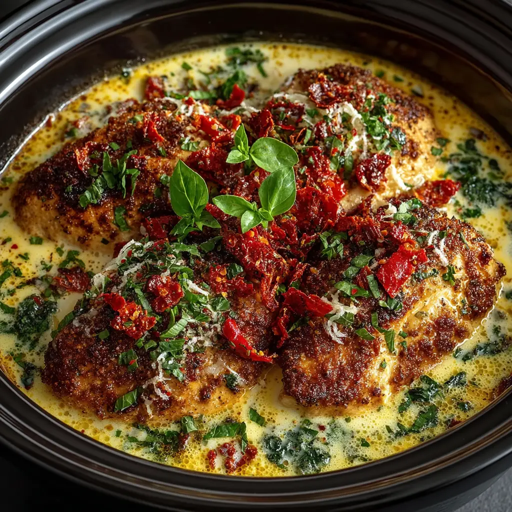 1. Combine Ingredients: Place the chicken breasts in the bottom of your crockpot. In a separate bowl, whisk together the heavy cream, chicken broth, minced garlic, Italian seasoning, and chopped sun-dried tomatoes. Pour this mixture evenly over the chicken.