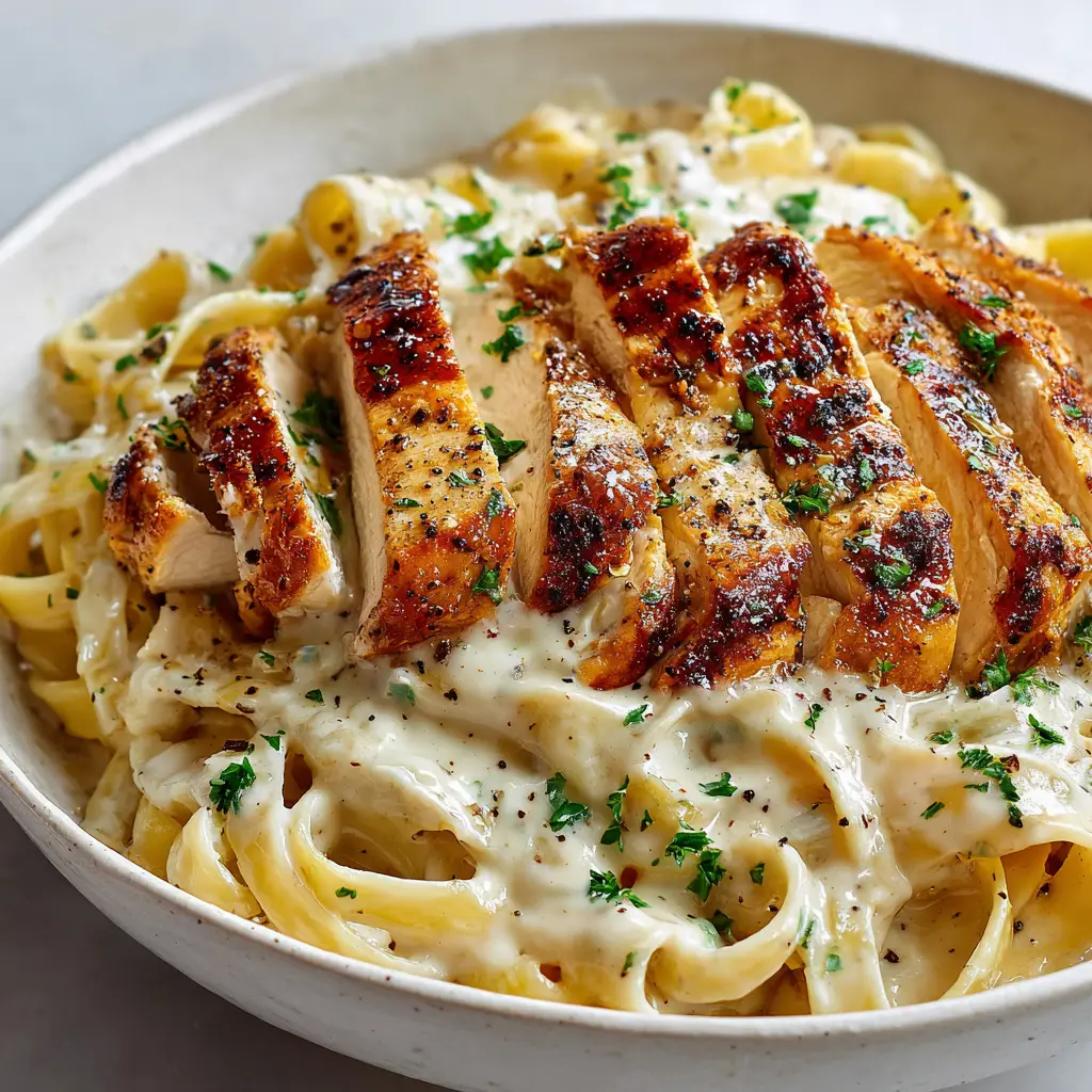 - Pour the sauce into a shallow skillet over low heat. Toss in the cooked fettuccine noodles until completely coated, using reserved pasta water if needed to thin. Top with thick slices of seared chicken, finely chopped fresh green parsley, and coarse cracked black pepper.