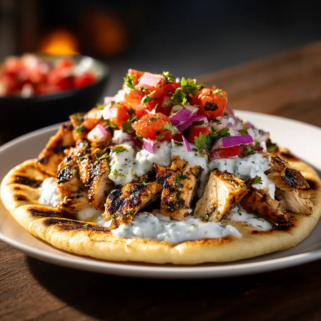 2. To assemble, lay a warm pita flat and top with a generous portion of the cooked chicken. Add a dollop of tzatziki sauce, halved cherry tomatoes, sliced red onion, and a sprinkle of feta cheese. Fold and serve immediately.
