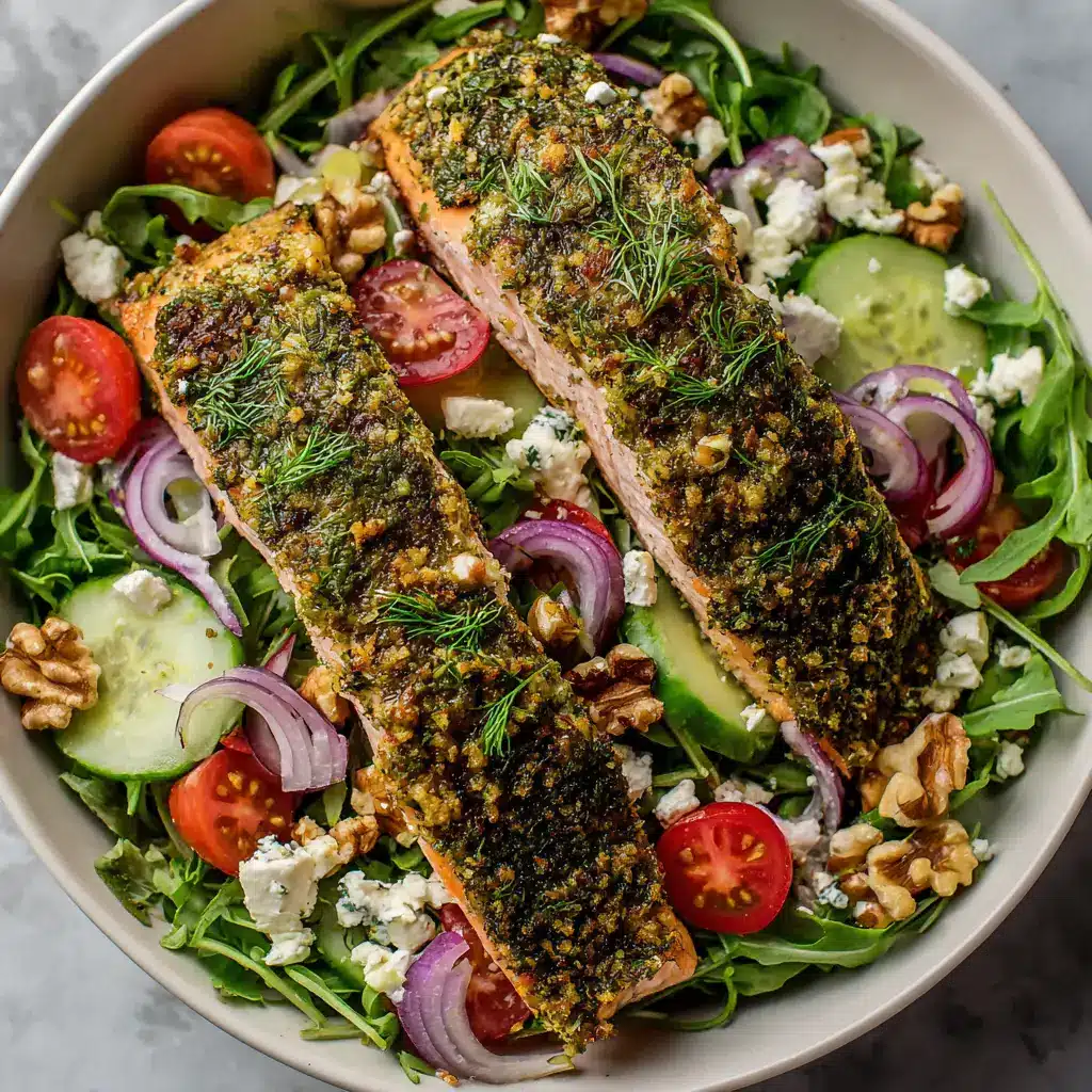 A vibrant and satisfying Herb-Crusted Salmon Salad featuring a perfectly cooked, crispy salmon fillet on a bed of fresh greens with a zesty homemade lemon vinaigrette. A healthy and delicious meal ready in under 30 minutes.
