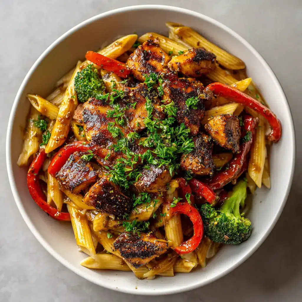 - Return the chicken, peppers, and broccoli to the skillet. Fold in the cooked penne pasta until thoroughly coated in the glaze. Garnish with finely chopped fresh green parsley and a dusting of coarse black pepper flakes before serving.