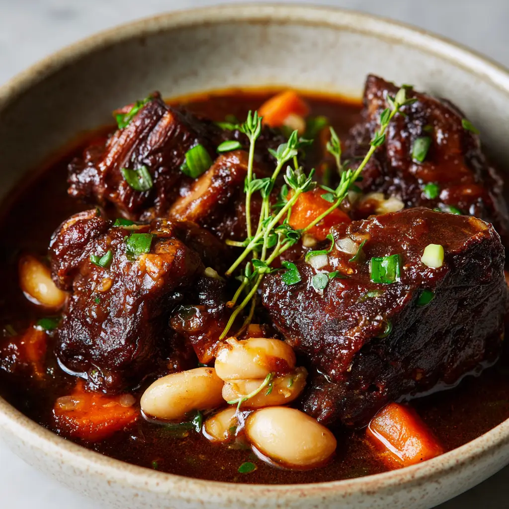 Remove the lid for the final 10-15 minutes to let the braising liquid reduce into a thick, dark brown, glossy gravy. Carefully ladle the slow-braised oxtail pieces into a rustic ceramic bowl. Finish the presentation by garnishing with a sprig of fresh green thyme and scattered chopped green scallions.