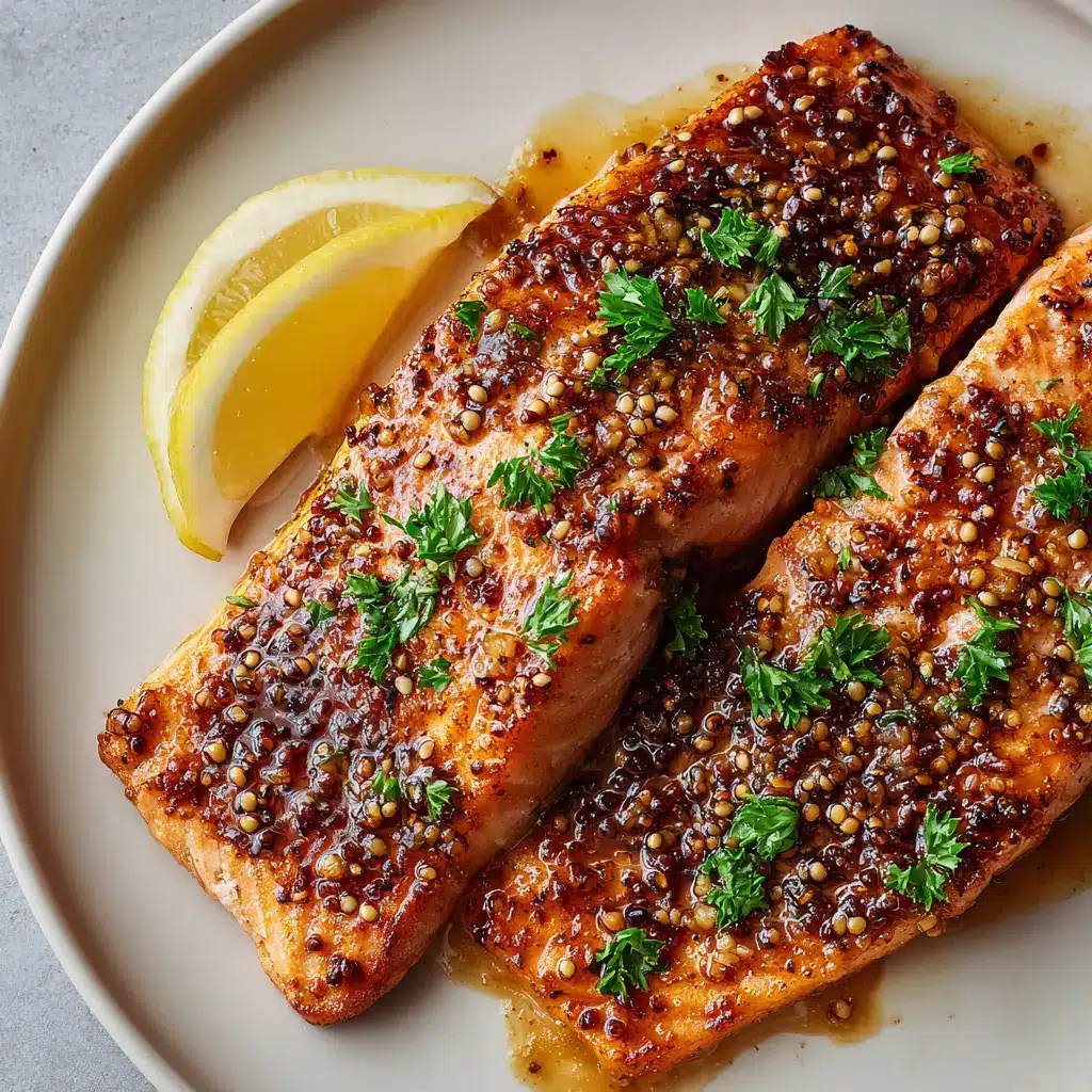 What truly sets this dish apart is the top of the fish, which is generously coated in a thick, sticky, glossy amber-brown glaze. Embedded within this stunning glaze are distinct whole grain mustard seeds, small flecks of minced garlic, and coarsely ground black pepper. Served with a vibrant dusting of finely chopped fresh green parsley and a fresh lemon wedge, it is a feast for both the eyes and the palate.