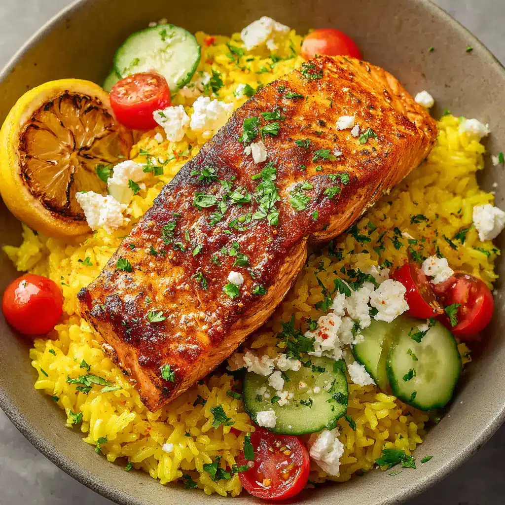 The Ultimate Mediterranean Salmon Bowl with Yellow Lemon Rice