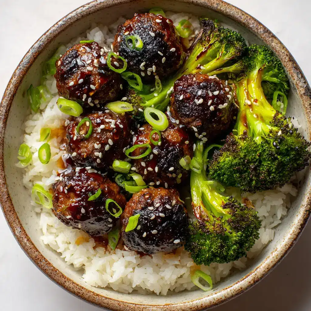 - Serve in a rustic ceramic bowl with a base of steamed rice, topped with the glazed meatballs. Arrange the broccoli alongside, let the sauce pool on the rice, and garnish with toasted sesame seeds and thinly sliced scallions.