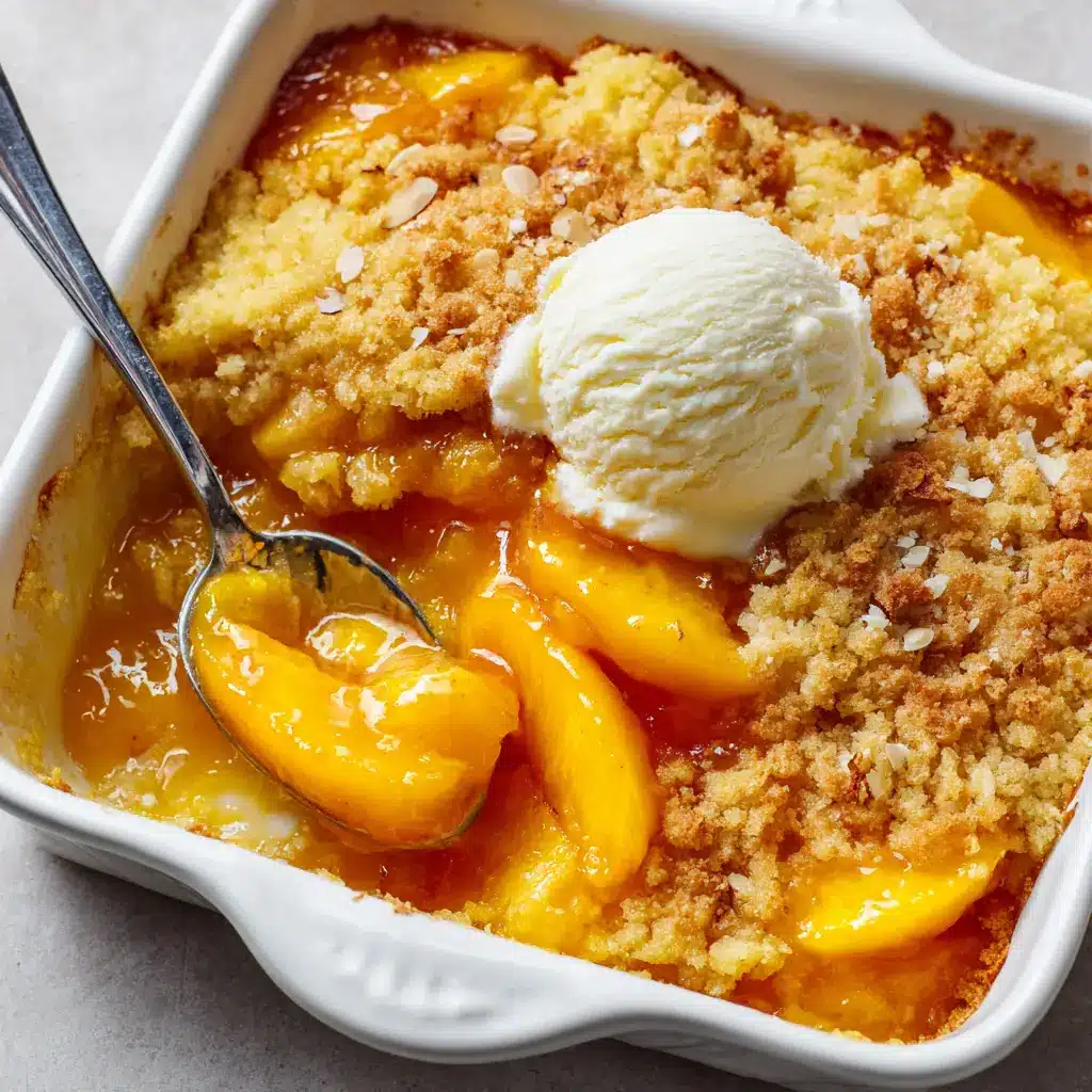 Serve warm. Use a silver serving spoon to scoop a generous portion, revealing the gooey peach layers underneath. Top immediately with a generous scoop of vanilla bean ice cream, and watch for those beautiful milky white streaks pooling into the warm peach syrup.