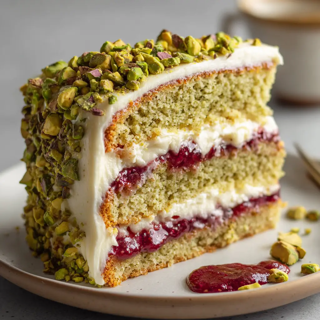 If you are hosting a refined dinner party, follow a beautiful main course like mediterranean-salmon or garlic-butter-shrimp with a slice of this cake. The light seafood pairs beautifully with the rich, nutty pistachio layers.