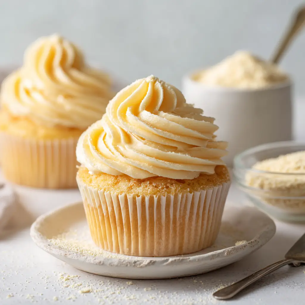 Pudding Buttercream Frosting piped beautifully on golden vanilla cupcakes.