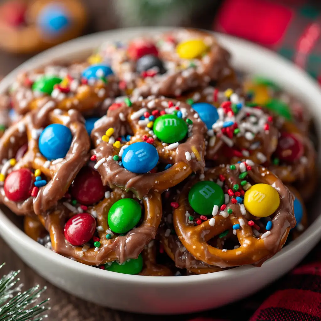 A macro shot showing a stack of Rolo pretzel bites with colorful M&M candies on top, highlighting the melted chocolate.