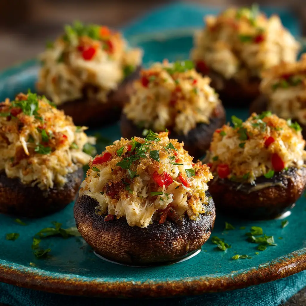 A close-up shot of baked crab-stuffed mushrooms, highlighting the creamy crab meat filling and golden breadcrumb topping.