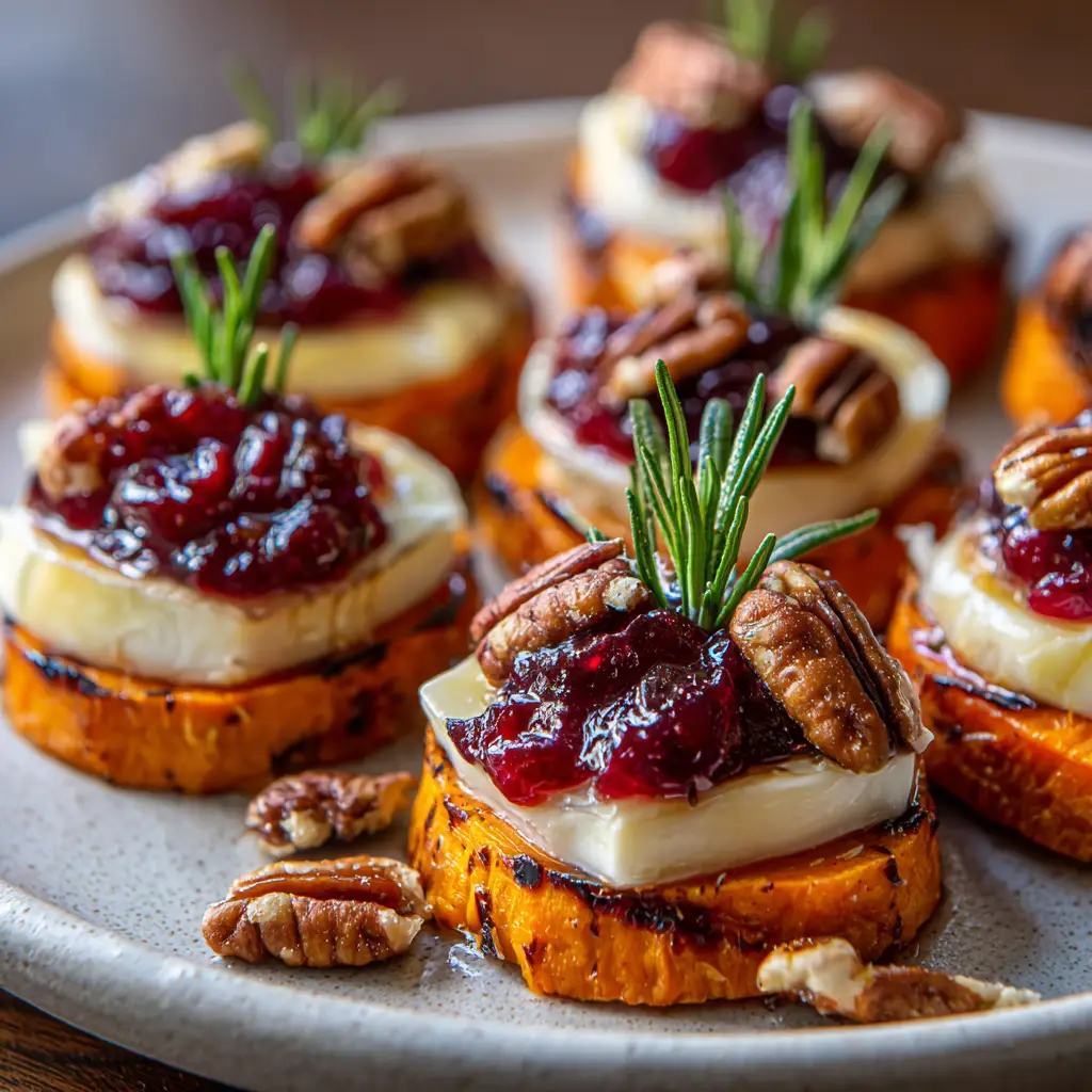 These visually stunning Sweet Potato Rounds feature thick, caramelized bases topped with draped brie cheese, thick whole cranberry sauce, toasted pecans, and fresh rosemary. The ultimate festive bite-sized holiday appetizer.